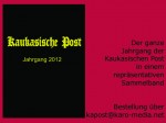 Ab sofort kann die Print-Ausgabe der Kaukasischen Post im Pdf-Format und per E-Mail-Versand abonniert werden. Damit können wir jeden interessierten Leser in jedem Winkel der Welt sofort nach Erscheinen der Zeitung erreichen und eine weltweite KaPost-Gemeinde aufbauen. Das Jahresabonnement kostet … Weiterlesen