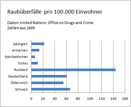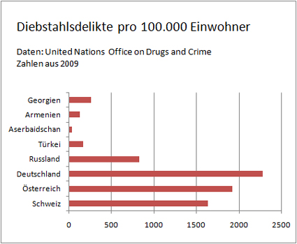 Wie die konkreten Zahlen zur Kriminalität wirklich aussehen zeigt die Statistik des United Nations Office on Drugs and Crimes: Die Kleinkriminalität in Georgien, ebenso wie in Armenien und Aserbaidschan, unterschreitet die Werte fast allenr europäischer Staaten, und zwar deutlich. 2009 wurden in Georgien 21,9 Raubüberfälle pro 100.000 Einwohner erfasst, in den drei deutschsprachigen Ländern waren es jedoch jeweils drei Mal so viele. 262 Diebstahlsdelikten pro 100.000 Einwohner in Georgien stehen fast 2300 Diebstähle pro 100.000 Einwohner in der Bundesrepublik Deutschland gegenüber.