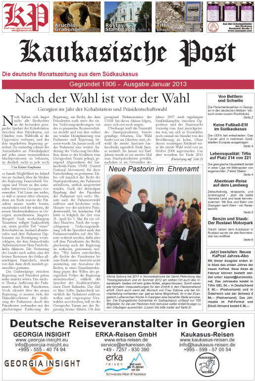 Weihnachten und Neujahr in Deutschland und Georgien dauern zusammen immer etwas länger. Grund auch für die Redaktion der Kaukasischen Post, sich einen Kurzurlaub zu gönnen, zumal bekannterweise zwischen deutschen Weihnachten und georgischem Neujahr nicht nur die lokale Szene in Tiflis mehr oder weniger ruht. Auch viele Ausländer haben sich für diese Tage nach Hause begeben. Deshalb erscheint die Januar-Ausgabe der Kaukasischen Post ausnahmsweise erst am 14. des Monats. Oben sehen Sie der Titel der aktuellen Ausgabe.