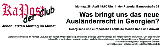 Um den deutschen Ausländern in Georgien einen sachkundigen Überblick über die neue Regelungen zu bieten, steht dieses Thema beim nächsten KaPost-Club am 28. März auf der Tagesordnung. Eingeladen sind Vertreter der zuständigen