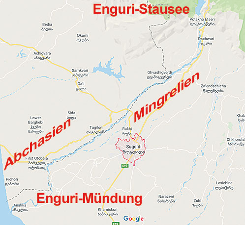 Ein Blick auf die Landkarte zeigt, dass die Buchmessen-PR die geographische Situation des Landes wohl völlig falsch darstellt. Der Enguri entspringt unterhalb des höchsten Berges Georgiens, dem Schkhara, und zwar aus dessen Gletscher heraus. Er fließt durch Ober-Swanetien und durch die atemberaubend schöne und wilde Enguri-Schlucht in den Enguri-Stausee. Unterhalb der Staumauer geht es weiter am Dorf Dschwari vorbei in Richtung Sugdidi. Bis kurz vor Sugdidi führt der Enguri nicht einen Kilometer durch Abchasien, erst nach dem Dorf Lia ist er dann hauptsächlich Grenzfluss zwischen den georgischen Provinzen Abchasien und Mingrelien, einige wenige Kilometer nur fließt er dabei komplett durch abchasisches Gebiet, alles andere als eine spektakuläre Landschaft. Kurz vor Anaklia, etwa beim Dorf Darcheli trennen sich Fluss und Grenze. Der Enguri mäandert noch ein paar Kilometer durch die mingrelische Ebene, um in Anaklia ins Schwarze Meer zu münden, rund drei Kilometer südlich der abchasischen Grenze. Eine bekannte Szenerie, spätestens seit Saakaschwili im Jahr 2012 den Enguri etwa 100 Meter vor seiner Mündung mit einer Holzbrücke überspannen ließ, um die beiden Teile seines geplanten, großen Badeparadieses Anaklia miteinander zu verbinden.